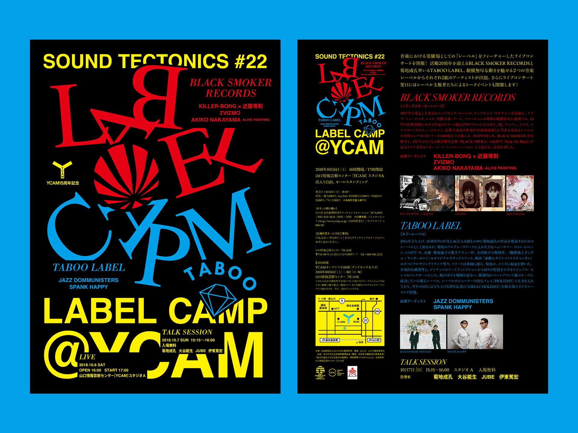 山口情報芸術センター(Yamaguchi Center for Arts and Media) 通称「YCAM(ワイカム)」は、山口県山口市にあるアートセンターです。こちらで開催された「sound tectonics #22: LABEL CAMP」のグラフィックデザインをさせていただきました。